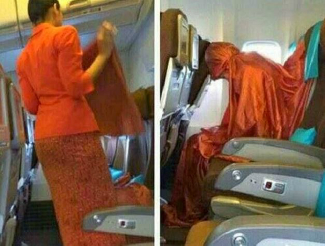 Also in May, a Malaysian passenger on board a Garuda Indonesia flight posted the photo above, in which a flight attendant took time off her busy schedule to pray on an empty passenger seat.
