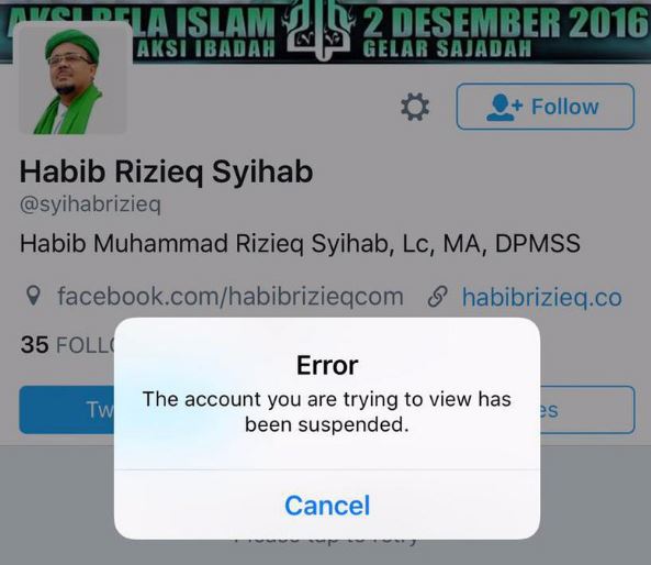 Another organization that FPI has apparently crossed the line with is social media giant Twitter, which suspended both the official FPI Twitter account (@dpp_fpi) and Rizieq’s personal account.