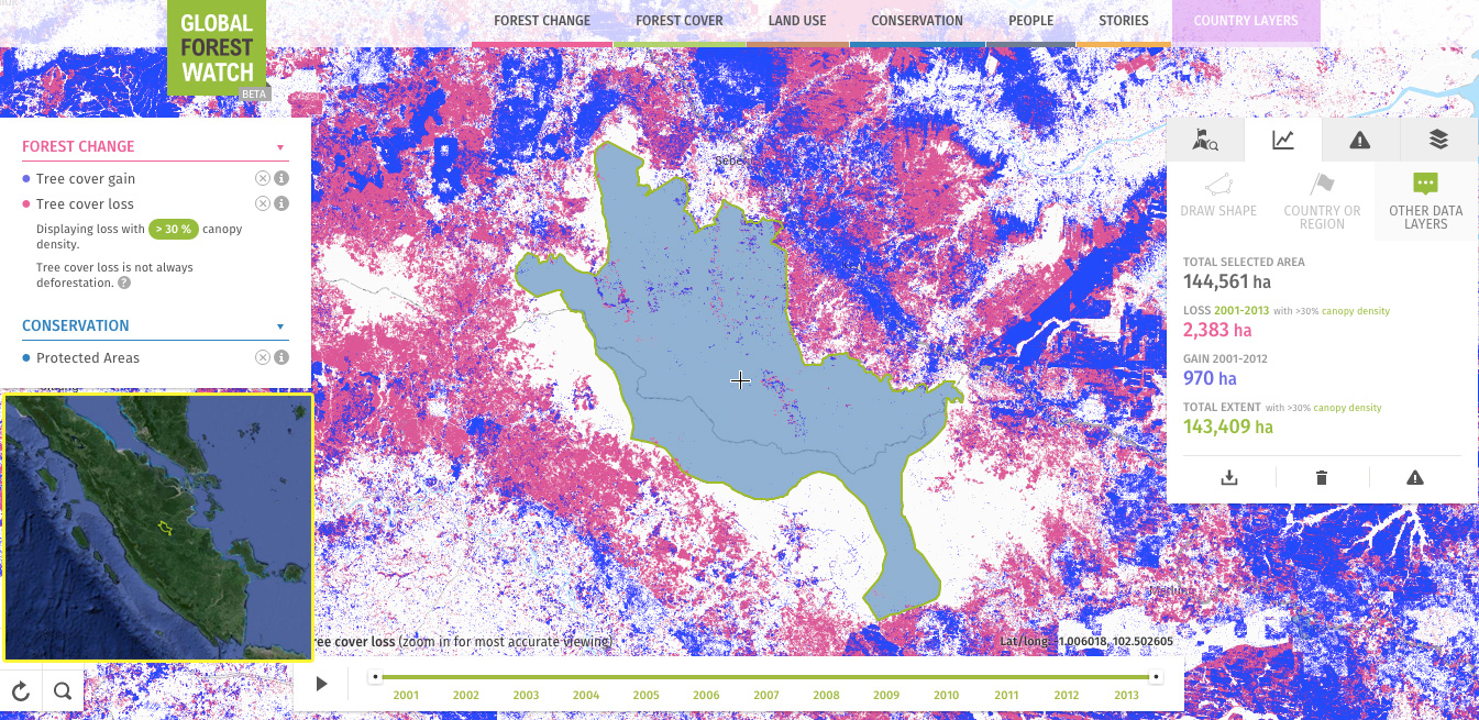 Global Forest Watch image showing forest loss and gain in and around Bukit Tigapuluh between 2000-2013. Courtesy of World Resources Institute.