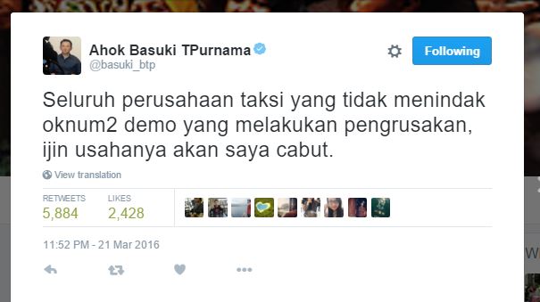 Jakarta Governor Basuki “Ahok” Tjahaja Purnama, on the other hand, made it very clear on Twitter that he will act decisively against the perpetrators of today’s chaos, as well as the companies that employ them.