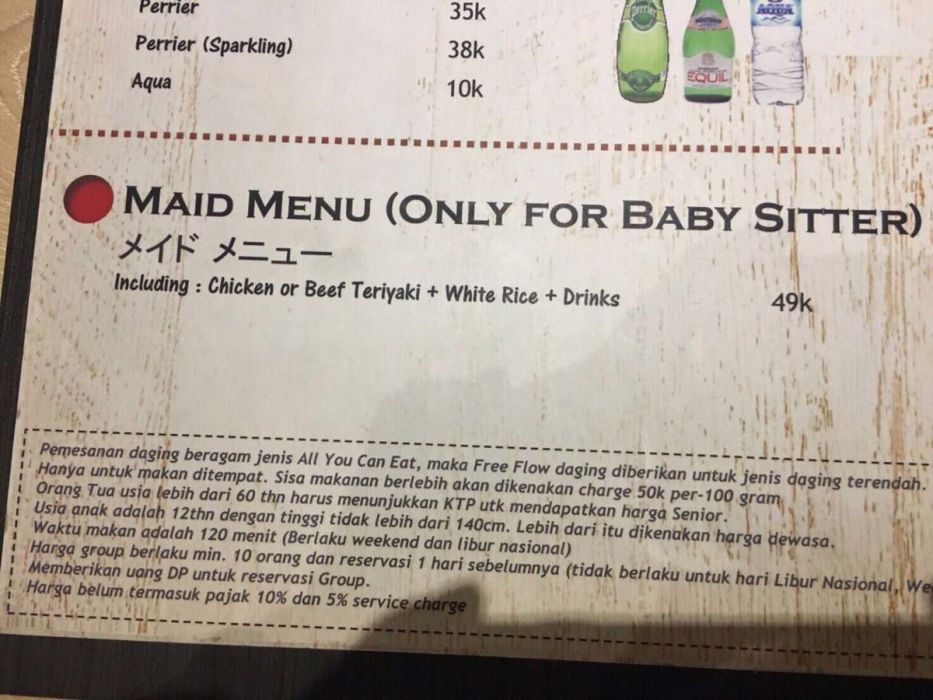 They’re not the only restaurant in Jakarta that has a special menu for helpers. Netizens have pointed out that another Japanese all-you-can-eat restaurant, KOBESHI by Shabu2House, also has a separate menu for babysitters, as seen in the scan of their menu in Zomato.com. (We contacted KOBESHI by Shabu2House this morning, and they confirmed that their menu in Zomato is up to date and the babysitter menu is still available.)