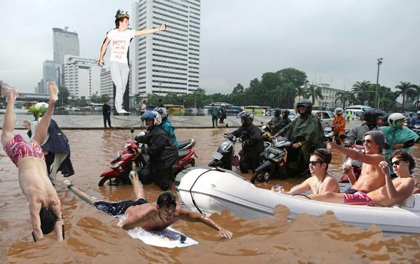 With the number one and two trending hashtags in Jakarta this morning, #WelcomeToIndonesia1D and #ANJIR1DKEINDO (which sorta translates to #HOLY-SHIT-ONE-DIRECTION-IS-COMING-TO-INDONESIA) Directioners took to Twitter and posted a very weird set of pictures in which Niall, Liam, Harry and Louis (and sometimes Zayn, even though he won’t be performing in Jakarta) have been photoshopped into various scenes from Jakarta, most featuring the city’s infamous floods.