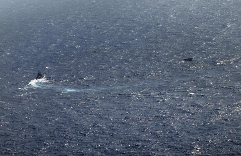 An Australian navy boat (L) shadowing a suspected asylum-seekers boat about 50 nautical miles south of Java island and sailing towards Australian waters. Photo: AFP