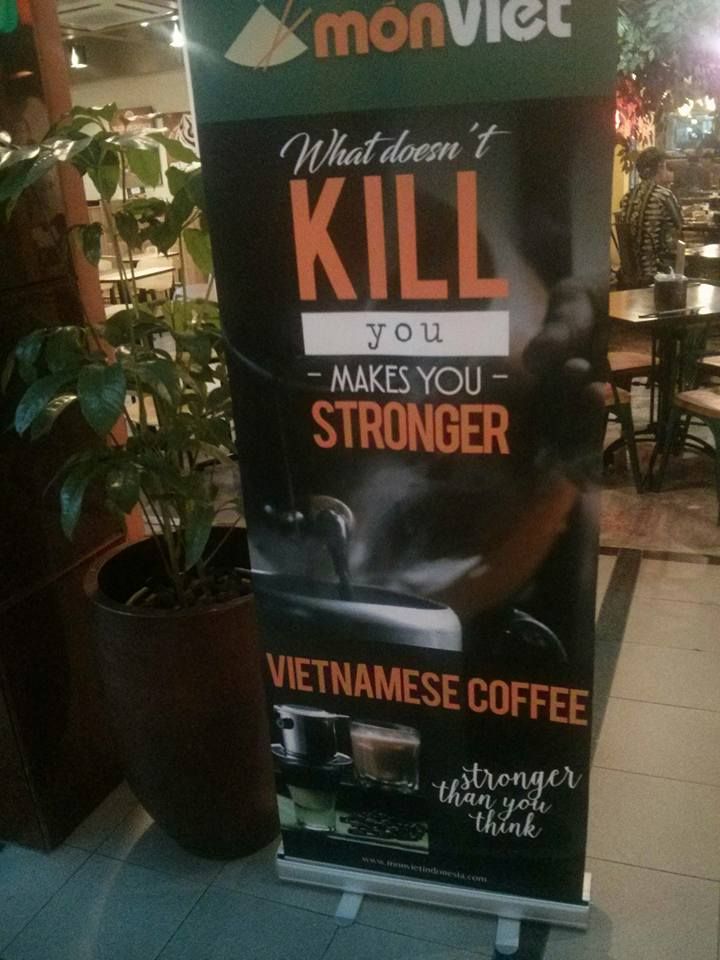 While this is, relatively speaking, not as bad as the Jessica brand coffee (in that it doesn’t actually use the image of anybody involved in the murder trial), we’d still have to say that this advertisement is in pretty bad taste. It’s even more disappointing because MonViet is generally considered one of the better Vietnamese restaurant chains in Jakarta.