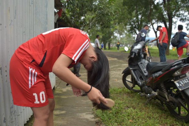 A footballer bombs her hair before a CSC training session in Jakarta on March 26, 2015. Photo: AFP/Adek Berry