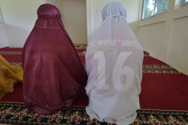With only four prayer robes available, the girls chatted as they waited their turn. They prayed calmly, their bodies completely covered apart from their faces – but you could still make out the back numbers on their jerseys through the thin robes.