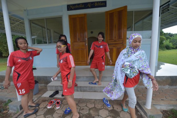 Women footballers leave the mosque before a training session in Jakarta on March 26, 2015. Photo: AFP/Adek Berry