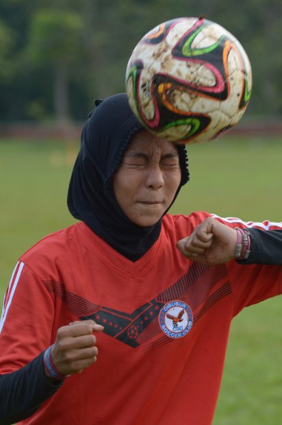 Of the two dozen girls at the training session that day, only one was wearing the hijab, a young woman named Vica Anyistiawati. “Come on,” cried a fellow player as they headed the ball to and fro. “Wait! I’m getting dizzy!” she yelled back.