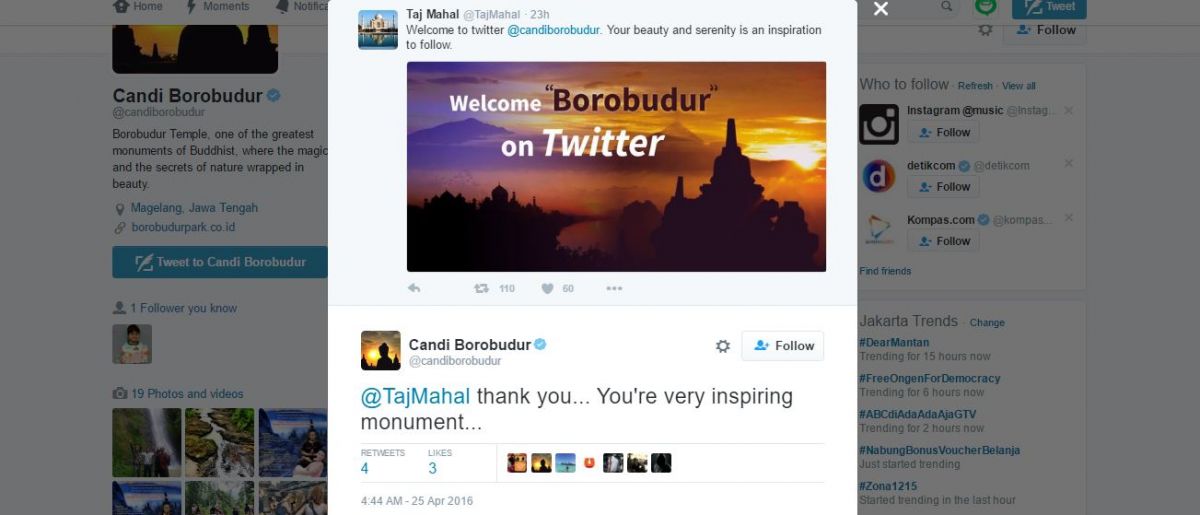 Arguably Indonesia’s most famous tourist attraction (besides the entire island of Bali) Borobudur was granted the blue check mark beside its Twitter handle (@candiborbudur) today along with two other cultural icons of Yogyakarta: Prambanan Temple (@candiprambanan) and Kraton Yogyakarta (@kratonjogja).