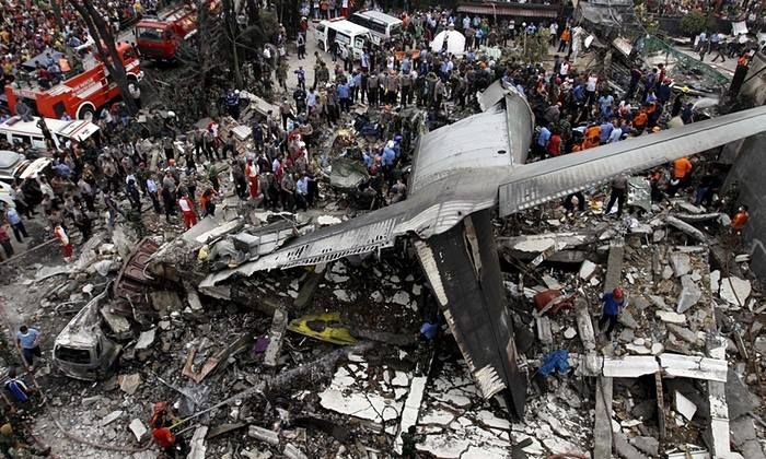 Security forces and rescue teams examine the wreckage of a military C-130 Hercules transport plane after it crashed into a residential area in the North Sumatra city of Medan on June 30. Photo: REUTERS/Roni Bintang