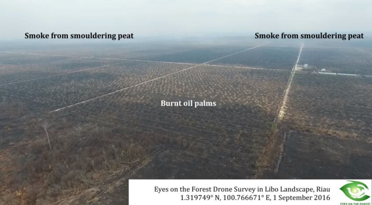 Using drones, EotF surveyed 10,000 hectares of APSL’s concession that had registered as hotspots in satellite imagery. The video footage shows enormous areas of burnt forests and peat surrounding area that is actively being used by APSL for palm oil plantations.