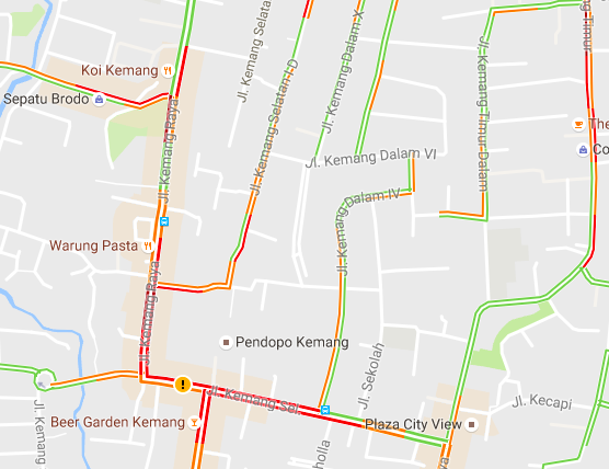Motorists are urged to avoid Jalan Kemang Selatan, where the Go-Jek office is located, because the drivers have reportedly blocked the road, causing traffic jams extending all the way to Jalan Kemang Raya. This was Google Maps’ live traffic reading of the area at 3:21 pm: