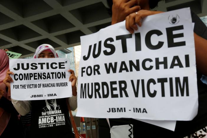 The case is being closely watched by the 300,000-strong migrant domestic helpers community in Hong Kong. Outside the High Court, about a dozen of their representatives held placards reading “Justice for Wanchai Murder Victim” and “Stop Violence”.