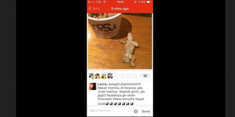 Kompas reported that the customer, identified as Lamia, last week posted on her Path account a photo of what appears to be a dead gecko she had just dug out of her tiramisu dessert. But apparently the way she discovered the creature was way worse that simply finding it buried inside the sweet: