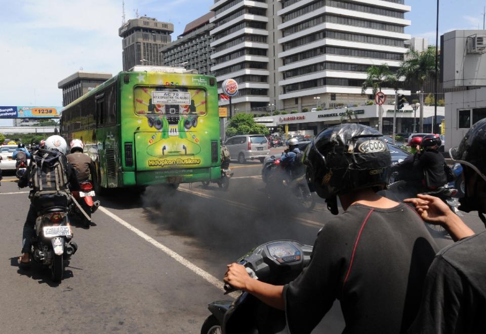 A commuter bus running on diesel fuel emits thick trail of pollutants in Jakarta on December 7, 2009 (AFP Photo/Romeo Gacad)
