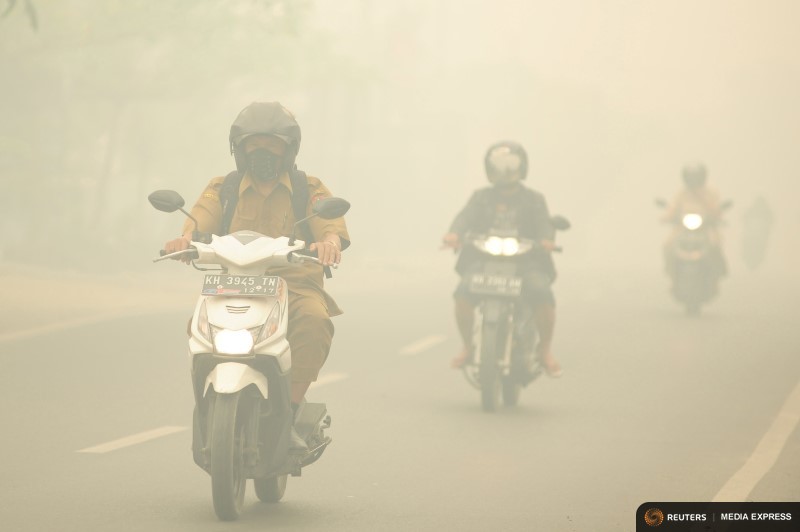 People ride motorcycles as haze shrouds the street in Palangkaraya in Central Kalimantan on October 27. Photo: REUTERS/JESSICA HELENA WUYSANG/ANTARA FOTO