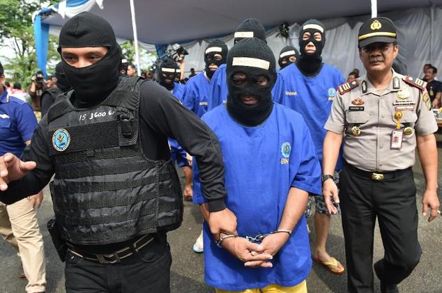 Arrested members of int’l drug syndicates are escorted by Indonesian police and agents of National Narcotics Agency, in Tangerang, on the outskirts of Jakarta, on January 27, 2015. Photo: AFP/BAYISMOYO
