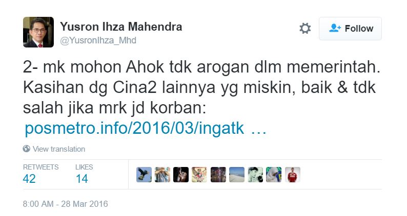 “If he (Yusron) tweeted to threaten me by saying be careful you poor Chinese or you’ll be slaughtered because of Ahok, then it’s vulgar and racist. Moreover, he is the Ambassador to Japan and the younger brother of Yusril,” Ahok said today as quoted by Kompas.