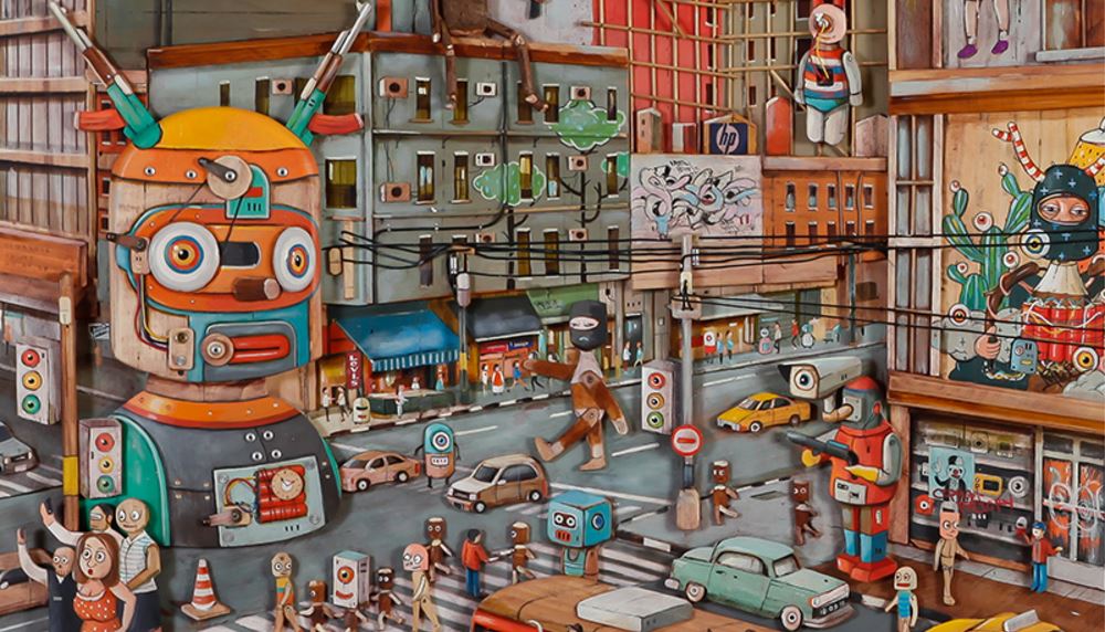 Gatot said that “Right or Wrong My Home” was inspired by the steadfast reaction of Jakartans to the terrorist attack that took place here in January. In describing the artwork, the artist wrote, “In every nation, a city becomes a symbol: a center of economy, governance, culture and crime. Through the proliferation of digital technology and new lifestyles, foreign cultures flourish and citizens unconsciously adopt homogenous and robotic mindsets and behaviors. Throughout the multiple life events of a nation, there remains an attitude that we should be proud; to survive and rise from the ordeal.”