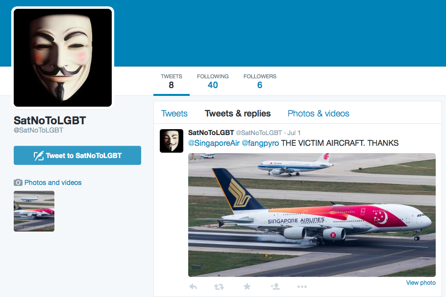 Ilham allegedly created a Twitter account, @SatNoToLGBT, with the sole intention of pulling off a prank – albeit a very dangerous one – on Singapore Airlines.