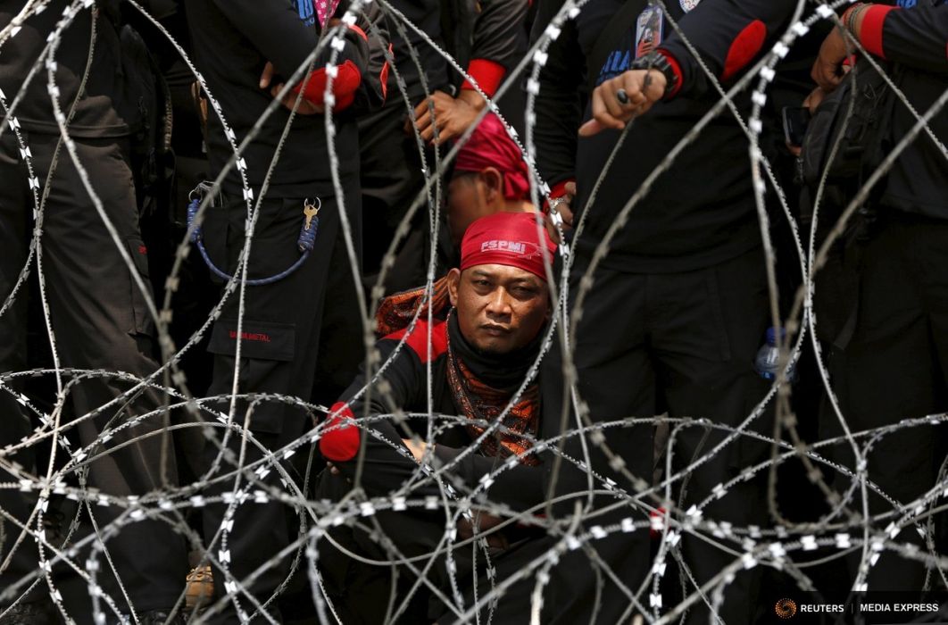 An Indonesian trade union supporter sits behind razor wire as he attends a protest outside the Presidential Palace in Jakarta September 1, 2015. Photo: Reuters / Beawiharta