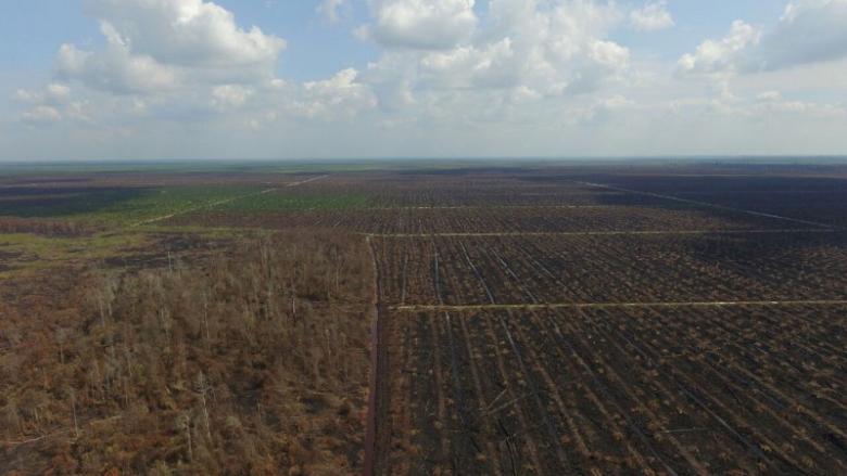 Plantation companies drain swampy peatland before planting their crops and the dried-out peat is particularly flammable and often catches fire when companies set fires to clear vegetation.