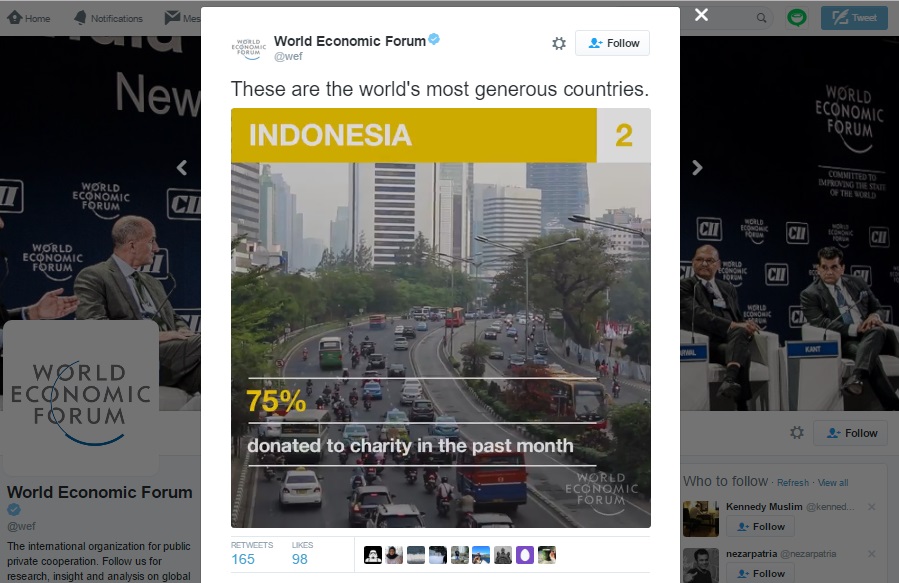 That’s right, Indonesia was ranked as the secound most generous country in the world. When asked if they had given to a charity in the last 30 days, a whopping 75% of Indonesians said they had, putting them above the citizens of countries with much higher average incomes such as the Netherlands, United Kingdoms and New Zealand.