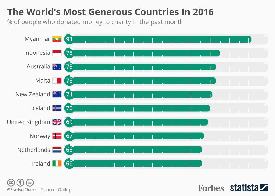 But far ahead of all those countries and Indonesia is Myanmar. Despite having a per capita GDP of just USD $824 per person (compared to $3,843 per person in Indonesia and $53,000 in the United States) 91% of Burmese reported giving to charity in the last month. Some analysts speculate their their generosity is at least partly attributable to the Buddhist principle of Sangha Dana, which teaches that giving and generosity in this life can bring you rewards in the next.
