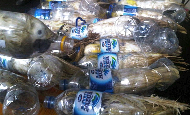 Last month, 23 yellow-crested cockatoos and a green parrot were found crammed into plastic water bottles aboard a ship at a port in the Indonesian city of Surabaya. The endangered creatures are commonly kept as household pets in Indonesia. Photo: Petrus Riski