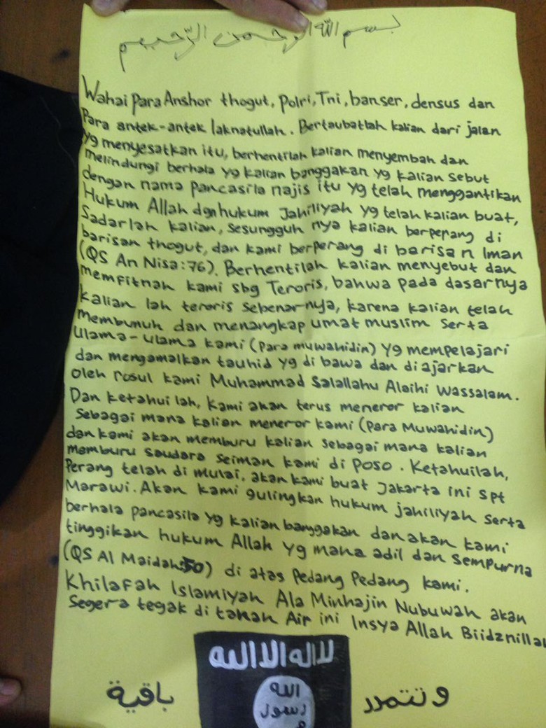 The note, as reported by Detik, contains a message imploring the police and military to stop idolizing the pluralist values that are promoted by Pancasila, the state ideology of Indonesia. The message also calls for the establishment of an Islamic caliphate in Indonesia, urging others not to call Islamic militants as terrorists before threatening that they’d terrorize the nation, turning Jakarta into a war zone like Marawi.