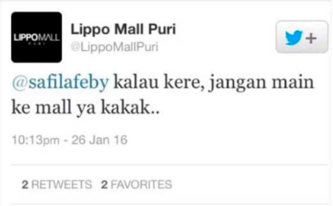 “We can confirm that we didn’t post [the tweets]. You can tell from the IP address, the person who tweeted yesterday used a different IP address,” said Nidia Ichsan, PT Lippo Malls Indonesia PR manager, as quoted by Detik today.