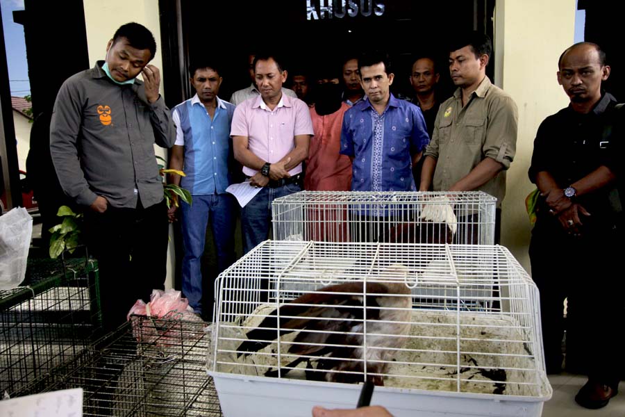 The suspect (center, wearing mask) is photographed with the animals he was caught trying to sell. Photo: Junaidi Hanafiah