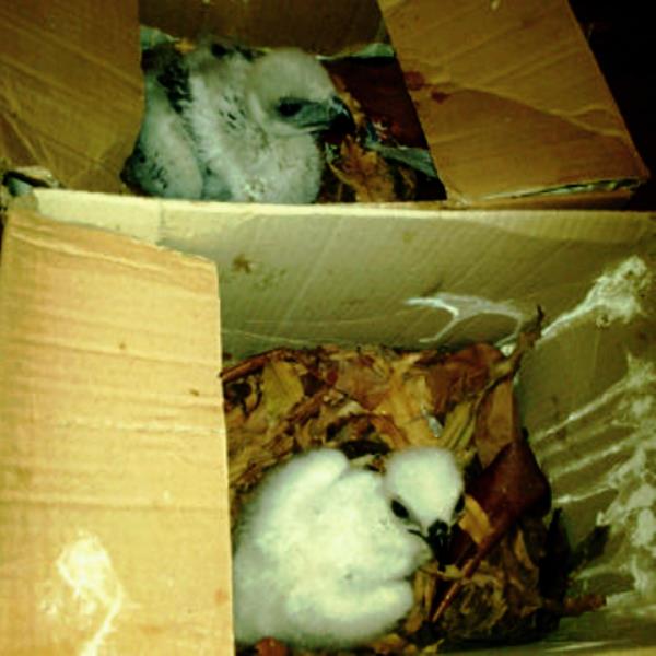Baby eagles packed in cardboard boxes at the house of wildlife traffickers who was recently arrested. Photo: Petrus Riski