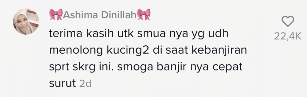 “Hopefully the flood will subside soon, poor furry kids are starving and cold out there,” the caption reads, ended with a #PrayForKalsel hashtag.