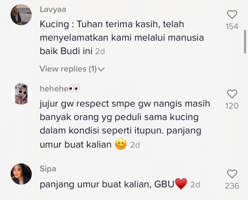 Honestly I respect [you guys] to the point that I cried, there are still many people who care for cats even in that condition. Long live for all of you.