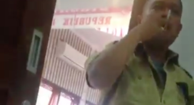 Not only is this civil servant just idly standing around, he also appears to be quite intoxicated by the way he’s slurring his words. He also took a drag off of his cigarette (though it does appear to be unlit). No fucks given indeed.
