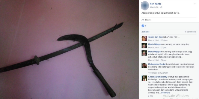 “The suspect had previously taunted other taxi drivers online via a provocative message on Facebook. FY (Feri Yanto) provoked them, then he posted photos and messages that essentially invited the taxi drivers to march and carry weapons while protesting,” said Jakarta Police Commissioner Mujiyono on Wednesday as quoted by Kompas.
