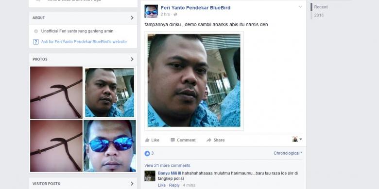 Police are still investigating many of the protesters who committed acts of violence during Tuesday’s chaotic public transportation driver protest. One of the people they have already arrested is the owner of a Facebook account “Feri Yanto Pendekar BlueBird” (Feri Yanto the BlueBird Swordsman), which showed a number of images of the BlueBird taxi driver as well as weapons.