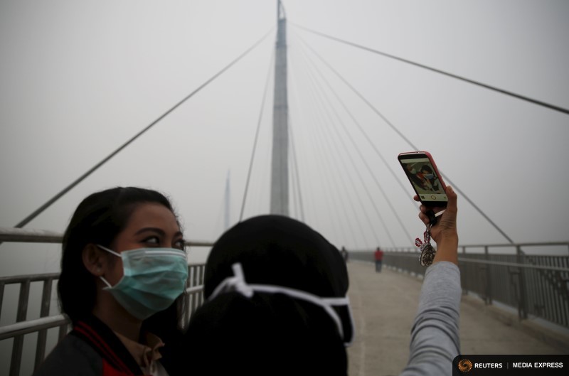 Girls take a selfie at the haze shrouded Batanghari River bridge in Jambi, Indonesia Sumatra island, September 14, 2015. Photo: REUTERS/BEAWIHARTA