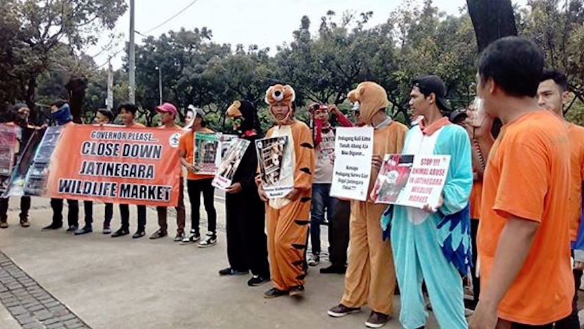 The protesters, from animal rights activists group Scorpion Wildlife Trade Monitoring Group, were specifically demanding that Governor Basuki “Ahok” Tjahaja Purnama and the Jakarta provincial government close down the Jatinegara wildlife market in East Jakarta, which is infamous for its illegal wildlife trade.