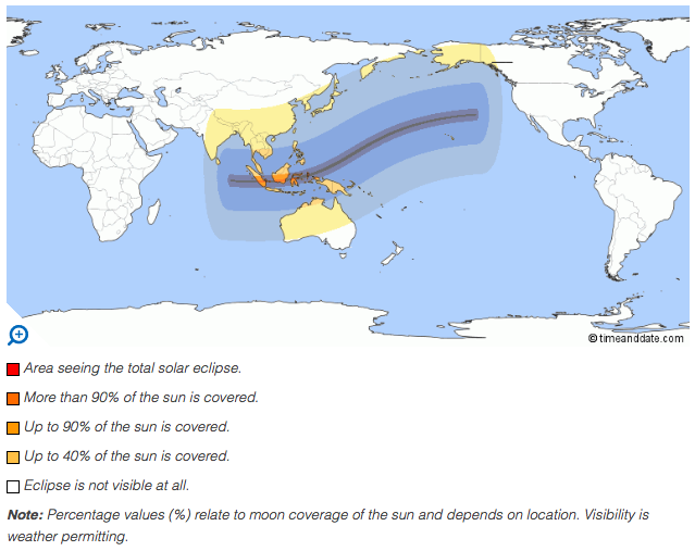 According to the The National Institute of Aeronautics and Space (Lapan), the total solar eclipse will be observable in 11 Indonesian provinces on March 9.