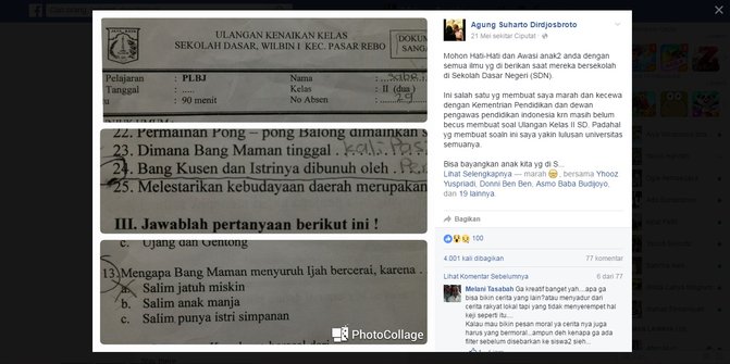 A few days ago, a parent whose child attends second grade at a public school in the Pasar Rebo district of East Jakarta, complained that his child was given the most inappropriate practice exam questions ever.