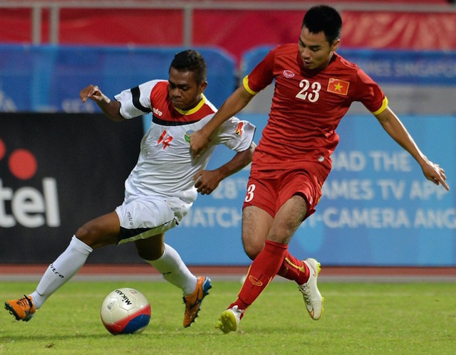 Frangcyatma Alves of East Timor (L) challenges for the ball against Pham Duc Huy of Vietnam (R) during their first round football match at the 28th Southeast Asian Games (SEA Games) in Singapore on June 7, 2015. Photo: AFP/Mohd Fyrol