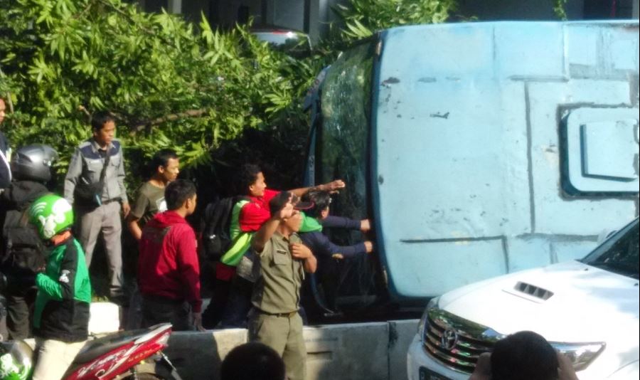A Transjakarta feeder bus traveling along the Senen-Lebak Bulus route got overturned while in the busway lane on Jalan Warung Buncit in South Jakarta this morning at around 8:30 am.