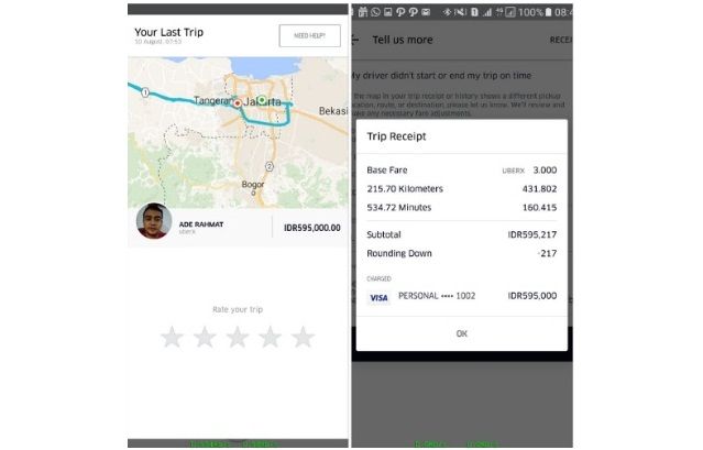 It appeared that the driver, for whatever reason, did not hit the ‘end trip’ button in his app at the end of the ride. The driver went on to drive around 200 km west towards the Banten province and the fare kept rolling all the way up until it reached Rp 595,000.