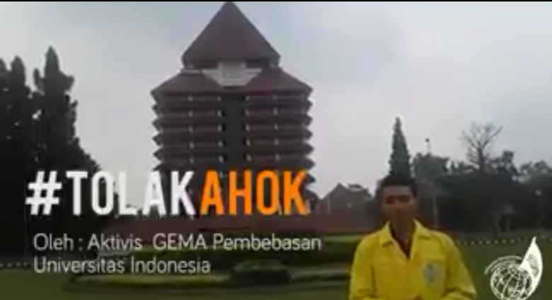 Boby, an activist for GEMA Pembebasan (Students’ Freedom Movement), called on viewers to #TolakAhok (#RejectAhok) and #TolakPemimpinKafir (#RejectInfidelLeaders), quoting the holy Quran to justify his argument that Muslims are prohibited from choosing non-Muslim leader.