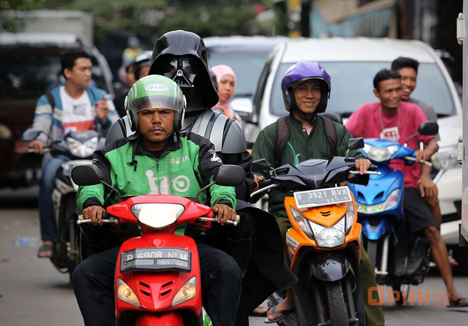 But Lord Vader did not spend all of his time in the capital visiting Thamrin. In the rest of the photoset, the intergalactic bad guy can be seen partaking in all sorts of everyday Jakarta activities. Such as riding a Go-Jek…