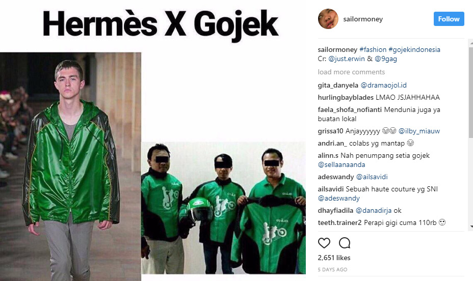 This isn’t even the first time that Indonesian netizens have pointed out a similarity between a piece of ridiculously expensive luxury apparel and the Go-Jek jacket. Last year, Hermes released a green and black jacket that some online also joked bore a striking resemblance to Go-Jek’s getup.