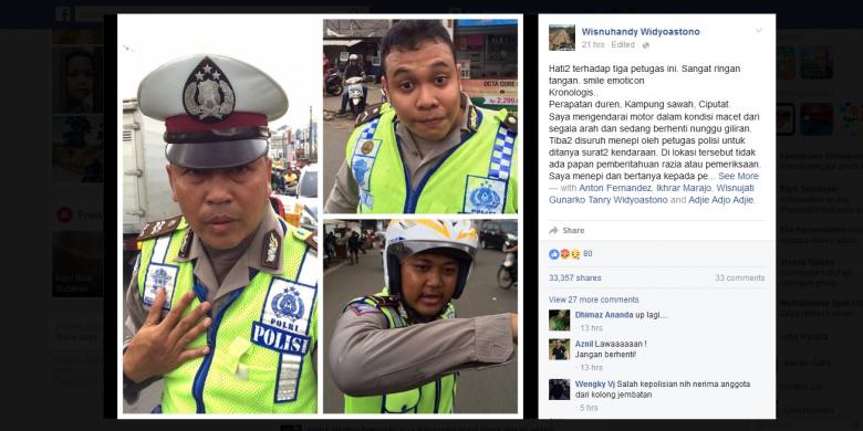 The poster, Wisnuhandy Widyoastono, wrote about how he was the victim of a police beating in Ciputat, South Tangerang, yesterday. It began when he was driving his motorcycle and got stuck in a traffic jam at a busy intersection. He claims that an officer told him to pull over for a license and registration inspection.
