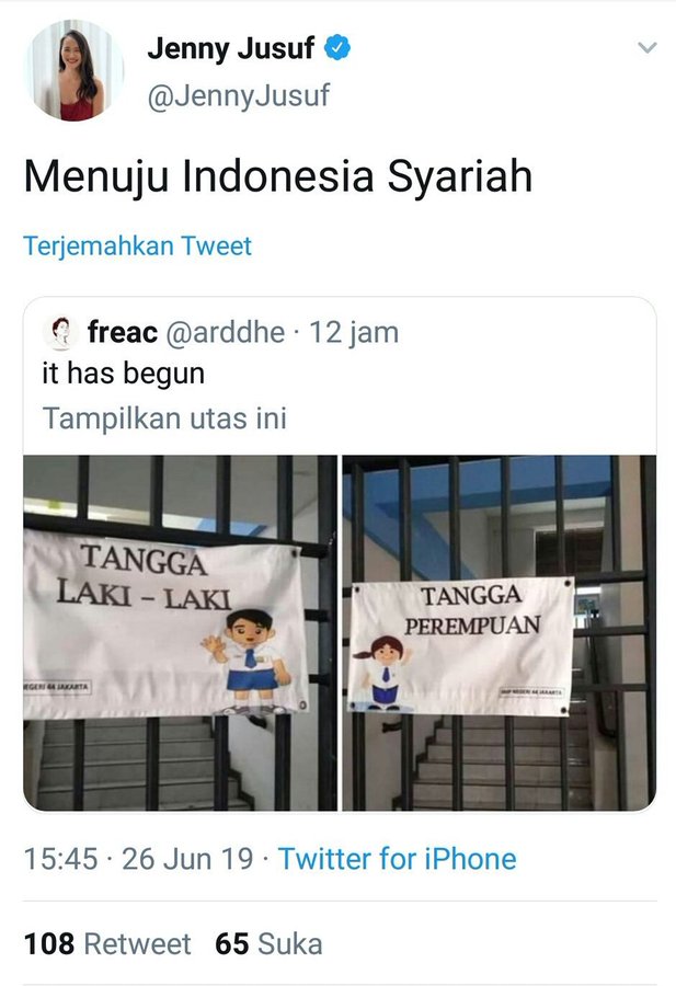 Many netizens were outraged by the school’s policy, including author Jenny Jusuf, who tweeted “heading towards a sharia Indonesia” when sharing the photos, implying that it exemplified a rise in conservatism in Indonesia in recent years (her tweet has since been deleted).